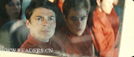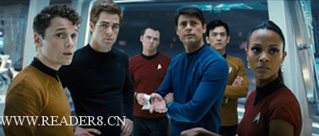 The Enterprise Crew: Pavel Chekov (Anton Yelchin), James T. Kirk (Chris Pine), Montgomery Scotty Scott (Simon Pegg), Leonard "Bones" McCoy (Karl Urban), Hikaru Sulu (John Cho) and Nyota Uhura (Zoe Saldana)