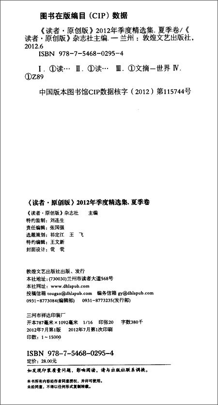 《<读者?原创版>2012年季度精选集:夏季卷》创刊于2004年9月,是国内领先的综合性原创青年杂志。杂志内容涉及社会、话题、职场、情感、人物、婚恋、美文、资讯等。内容形式新颖丰寓,原创首发内容集报道、访谈、言论、评论、随笔、故事、散文、图片等多种形式于一体,与《读者》和时代精髓一脉相承,又散发着自己的独特气质。《<读者?原创版>2012年季度精选集:夏季卷》荟萃2012年夏季文章精华,以飨读者。