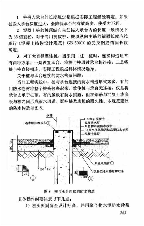 当前工程实践中,桩与承台连接的防水构造形式繁多,有的用防水卷材将整个桩头包裹起来,致使桩与承台无连接,仅是将承台支承于桩顶;有的虽设有防水措施,但在钢筋与混凝土或底板与桩之间形成渗水通道,影响桩及底板的耐久性。本规范建议的防水构造如图8。
