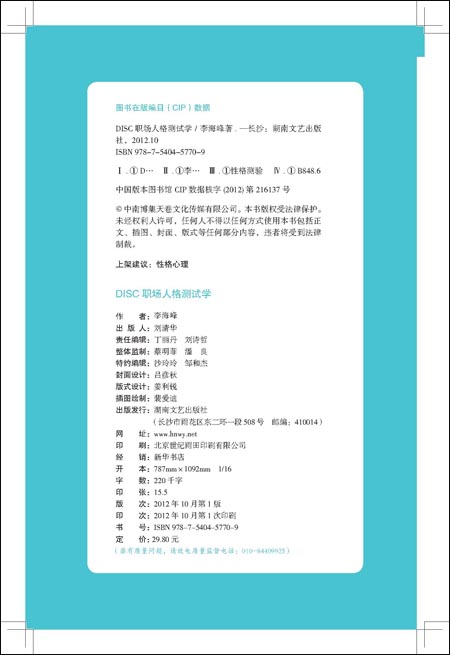 《DISC职场人格测试学》编辑推荐:最好读:风趣幽默的语言,通过一个个真实的案例,深入浅出地讲解DISC工具的原理和使用方法,全面改善你的职场人际交流方式。最亲切:结合我们喜闻乐见的身边案例、电影桥段以及西游、三国故事,分析我们熟悉的人物的性格,从而折射出我们自己。最实用:超过200张手绘图片和表格,让你对自己和职场同事的性格分析变得简单起来,让你能随时随地使用来自DISC的理论!
